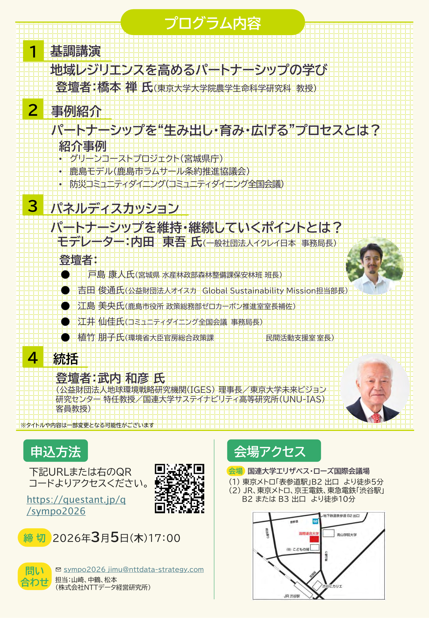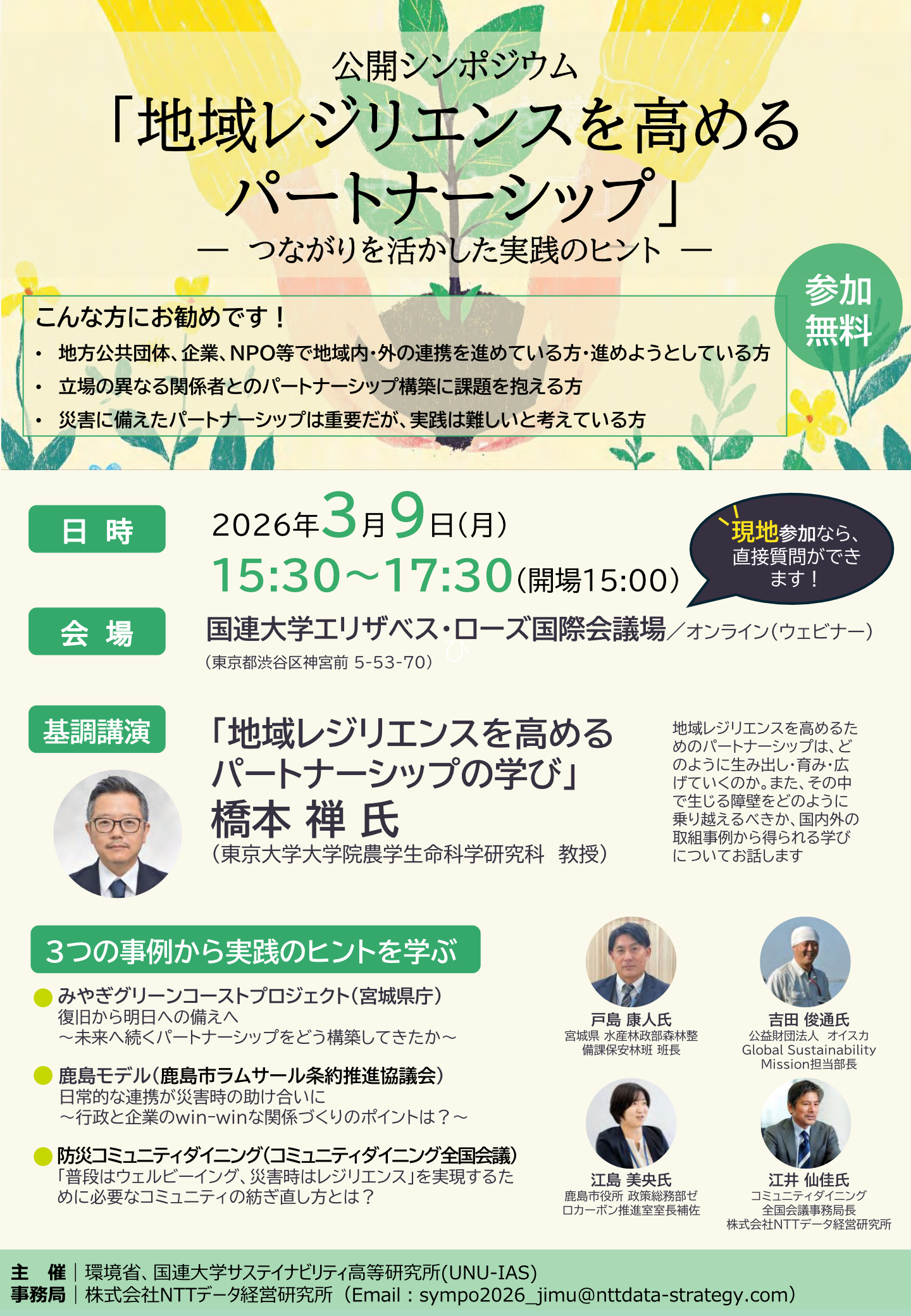 2026年3月9日、環境省と国連大学は、地域レジリエンス向上に向けたパートナーシップの在り方をテーマに、公開シンポジウム「地域レジリエンスを高めるパートナーシップ―つながりを活かした実践のヒント―」を開催しました。気候変動の激甚化や人口減少・高齢化が進む中、地域が直面する新たなリスクにどのように備えるかについて、多様な立場から議論が行われました。